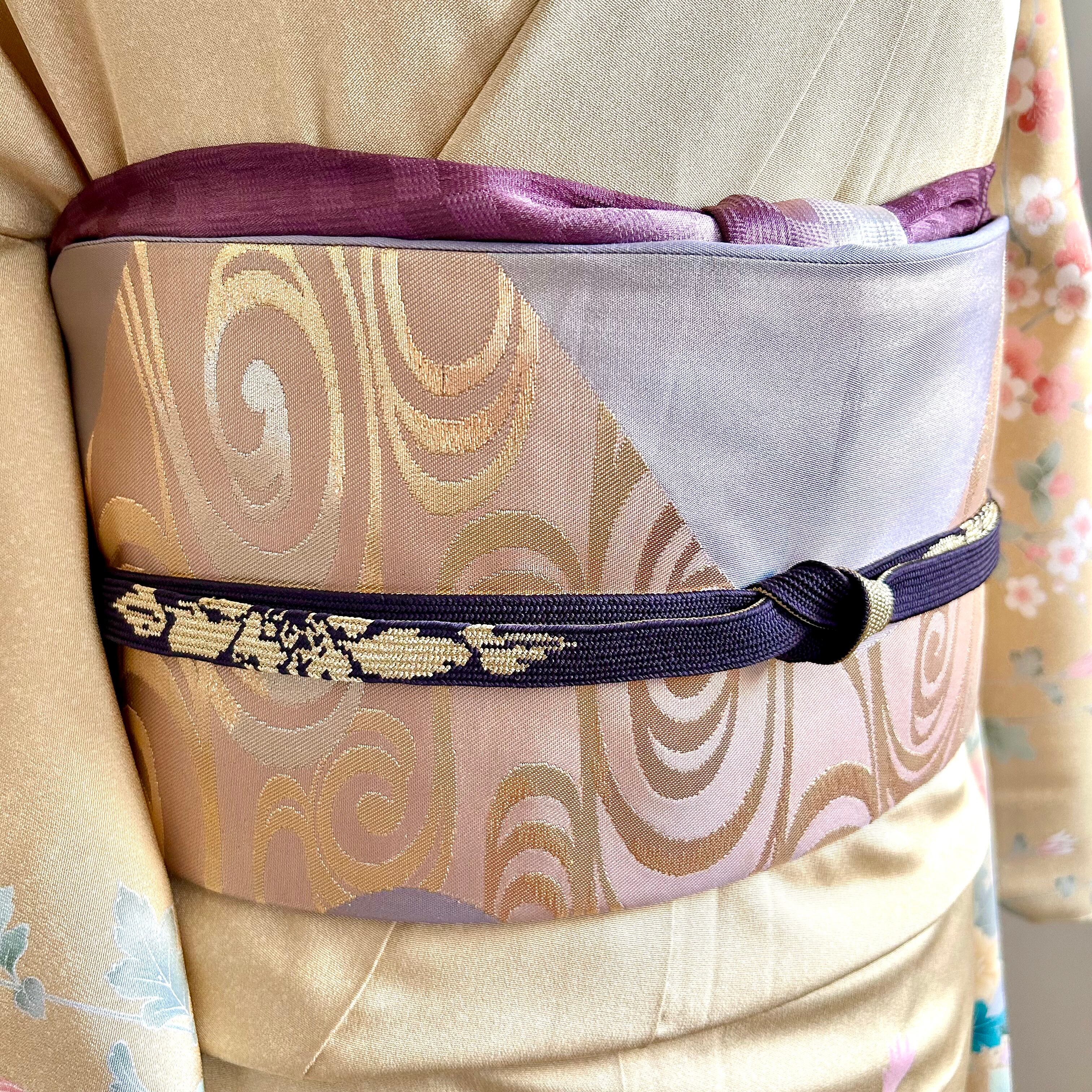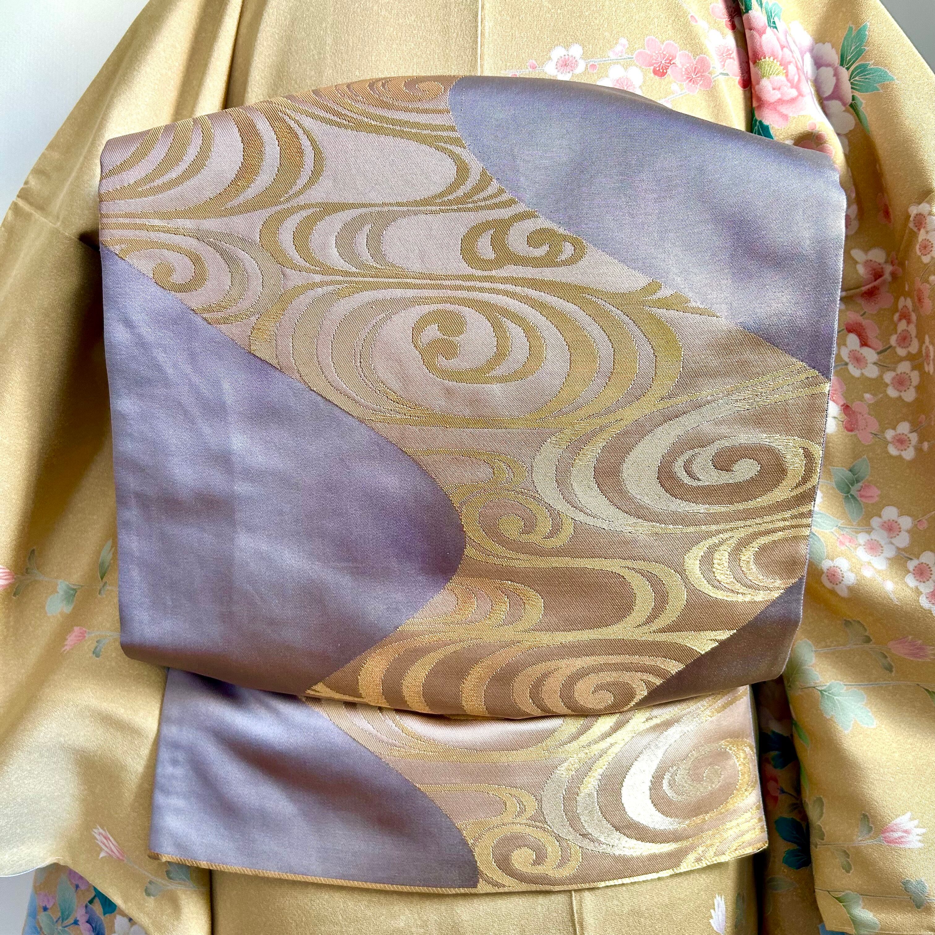 帯は、紫がかったグレーにゴールドの観世水が描かれたシンプルなデザイン。