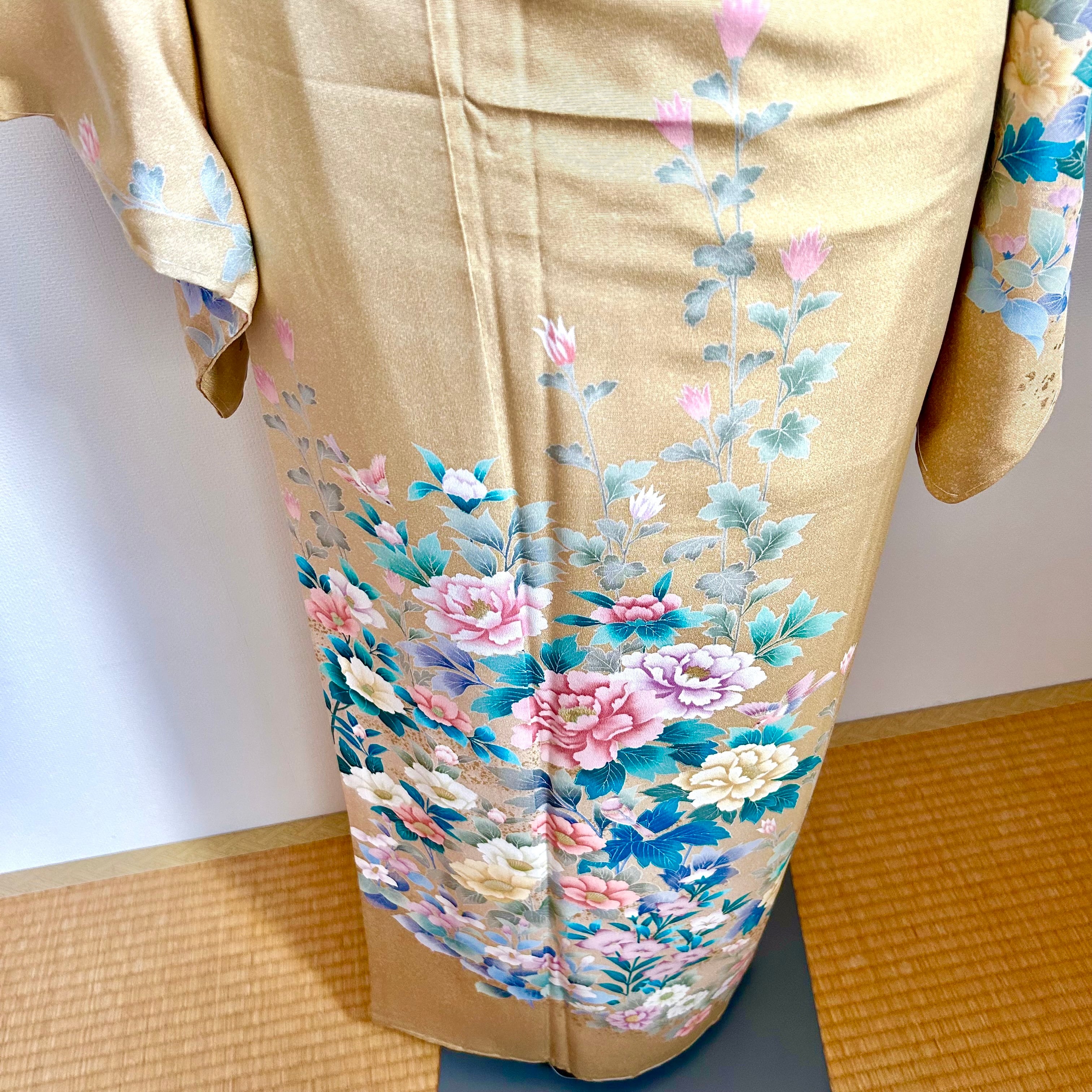 【美品】訪問着 ベージュグラデーション あられ 牡丹や鳥 袋帯 グレー ゴールド 観世水