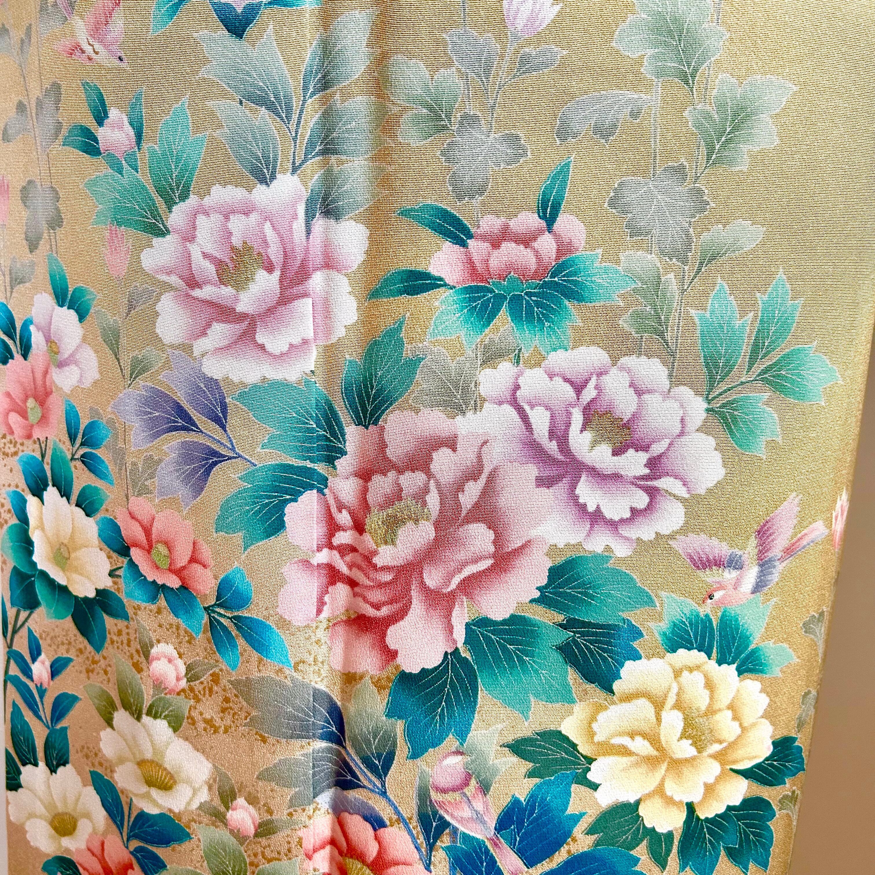 ところどころ金銀が散りばめられており、牡丹などの花や鳥が描かれています。