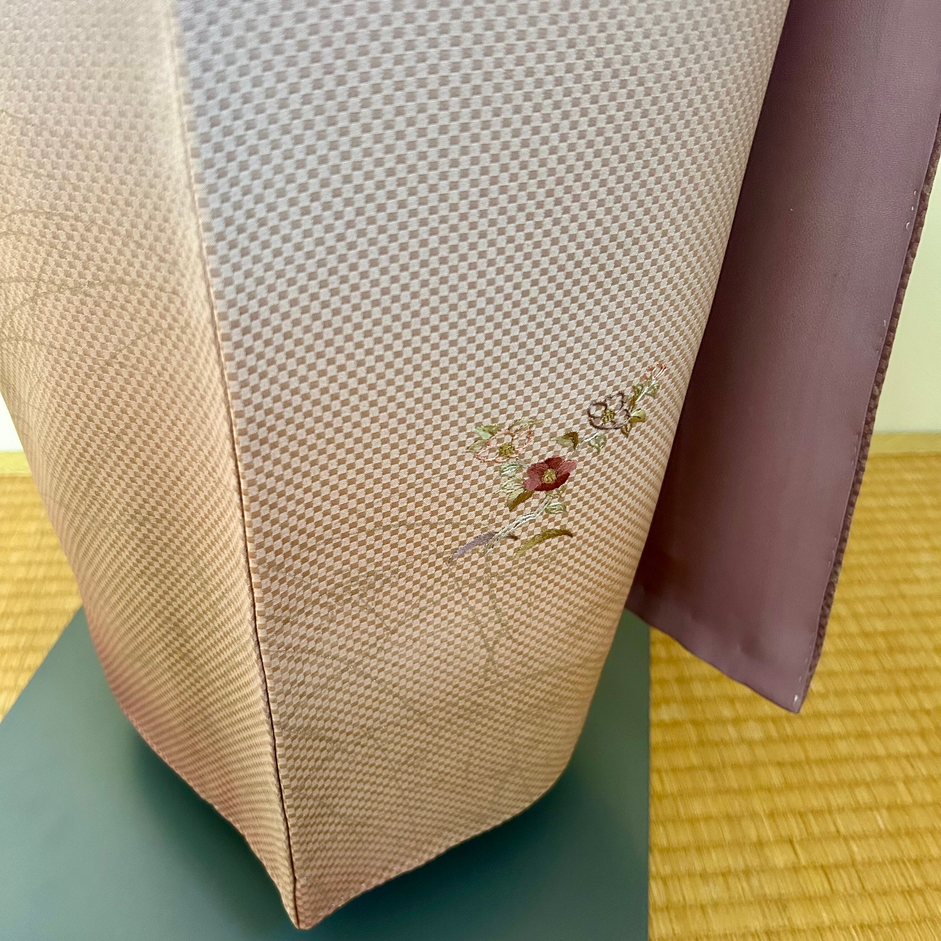 【美品】訪問着 紫 グラデーション 一つ紋 市松 袋帯 刺繍 ゴールド 牡丹 萩 刺繍