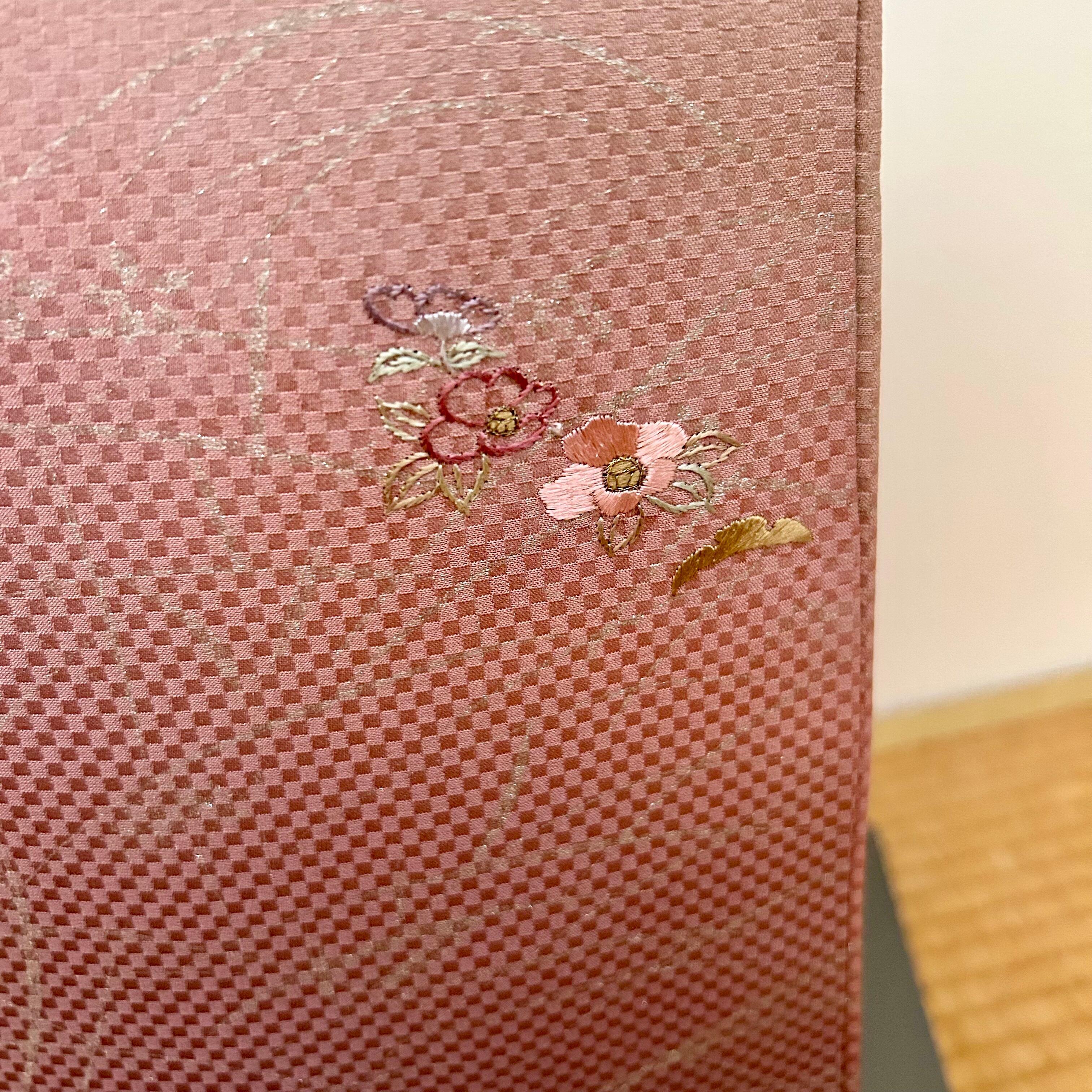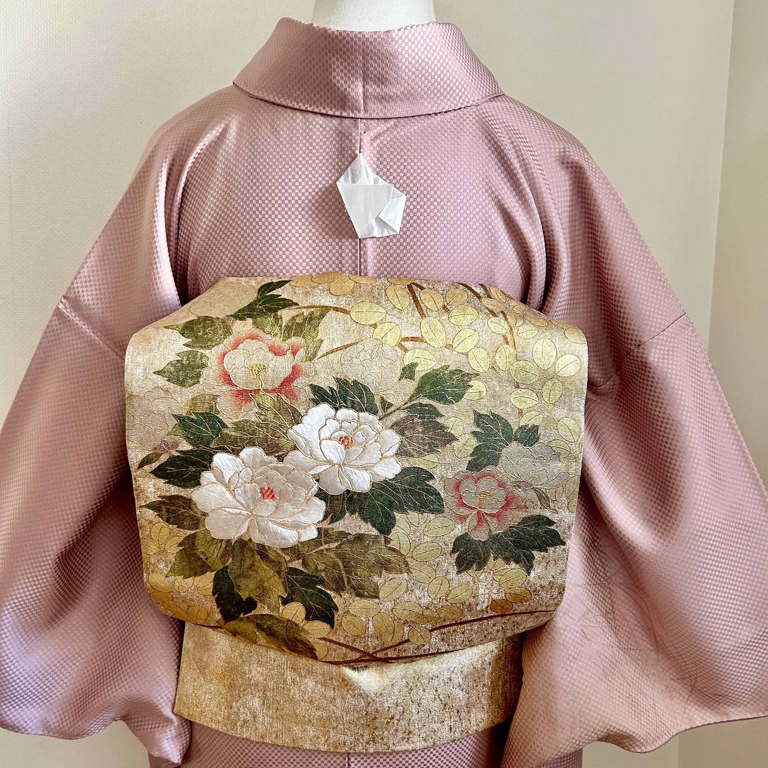 帯はゴールド地に萩や牡丹などが描かれた袋帯。