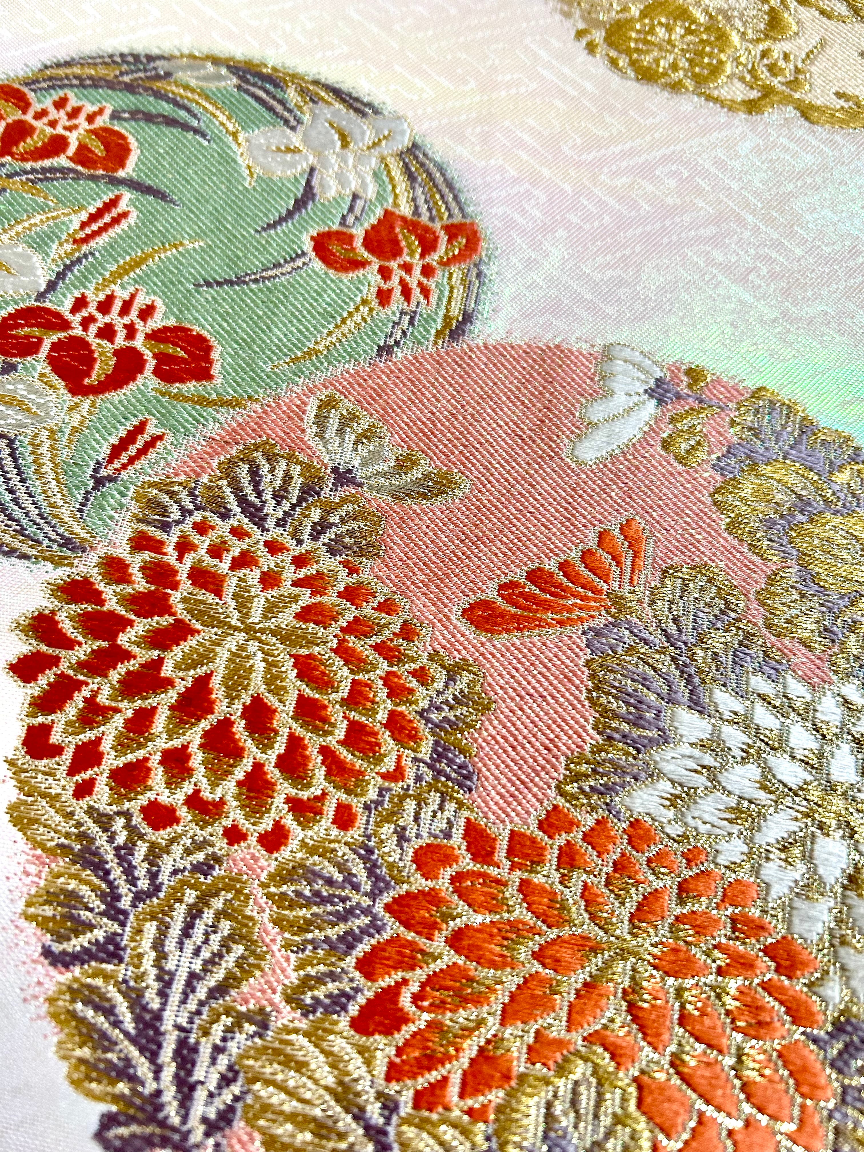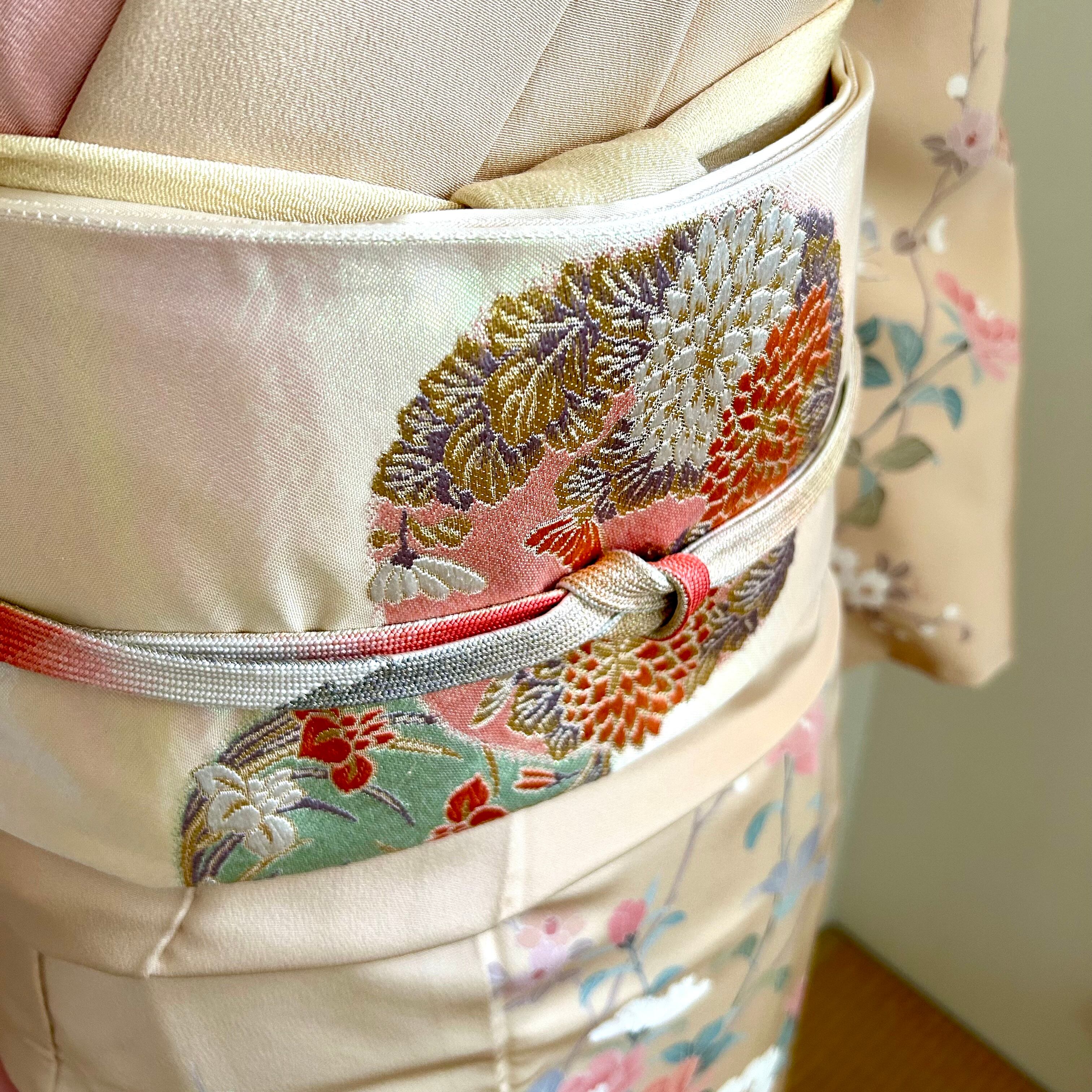 帯は、菊・梅・笹などの刺繍が入った、おめでたい雰囲気の袋帯。