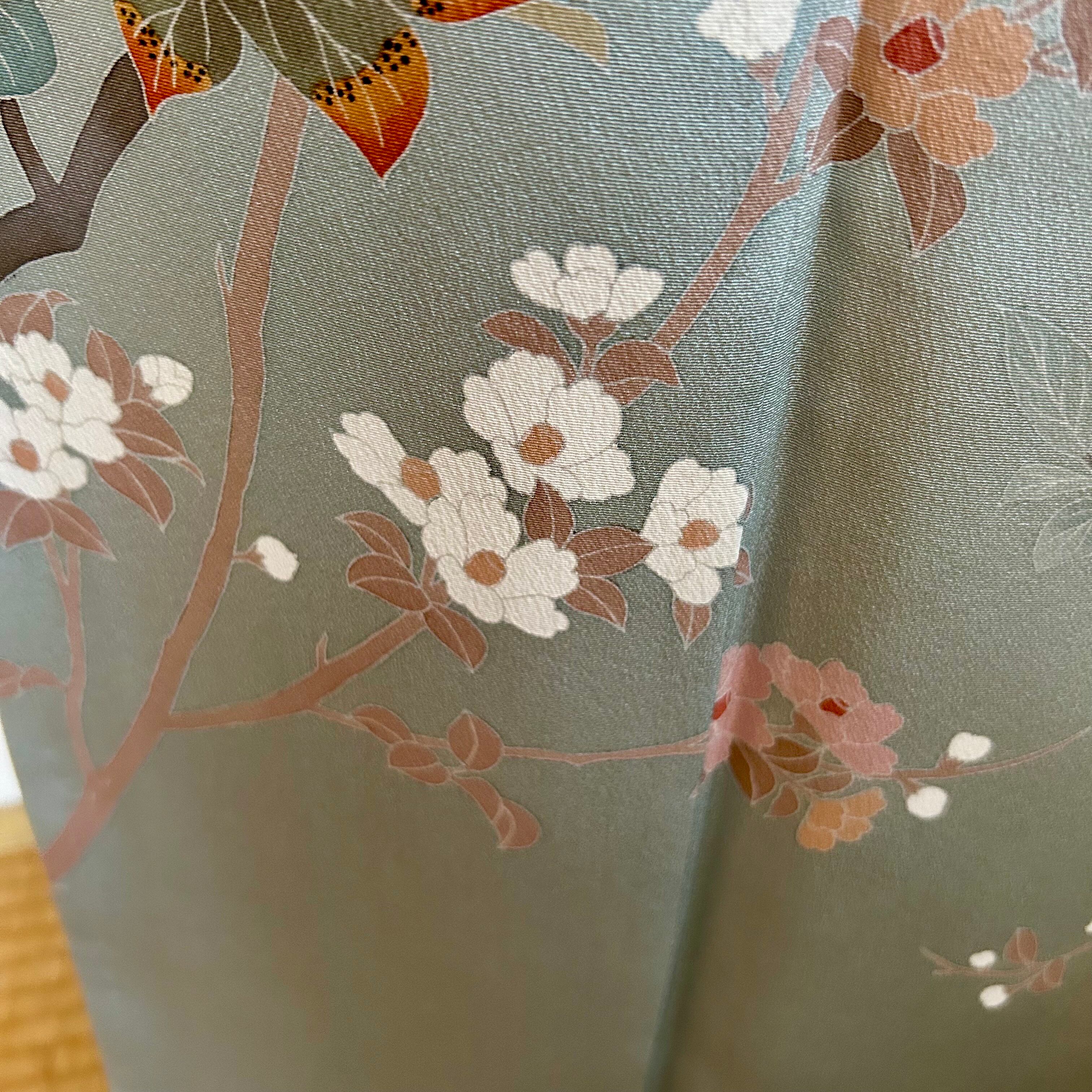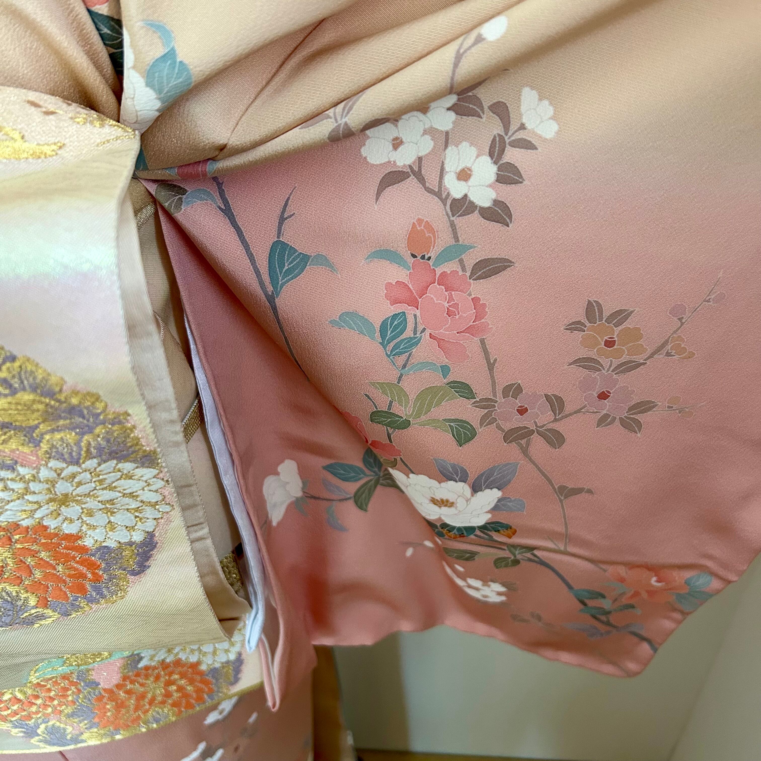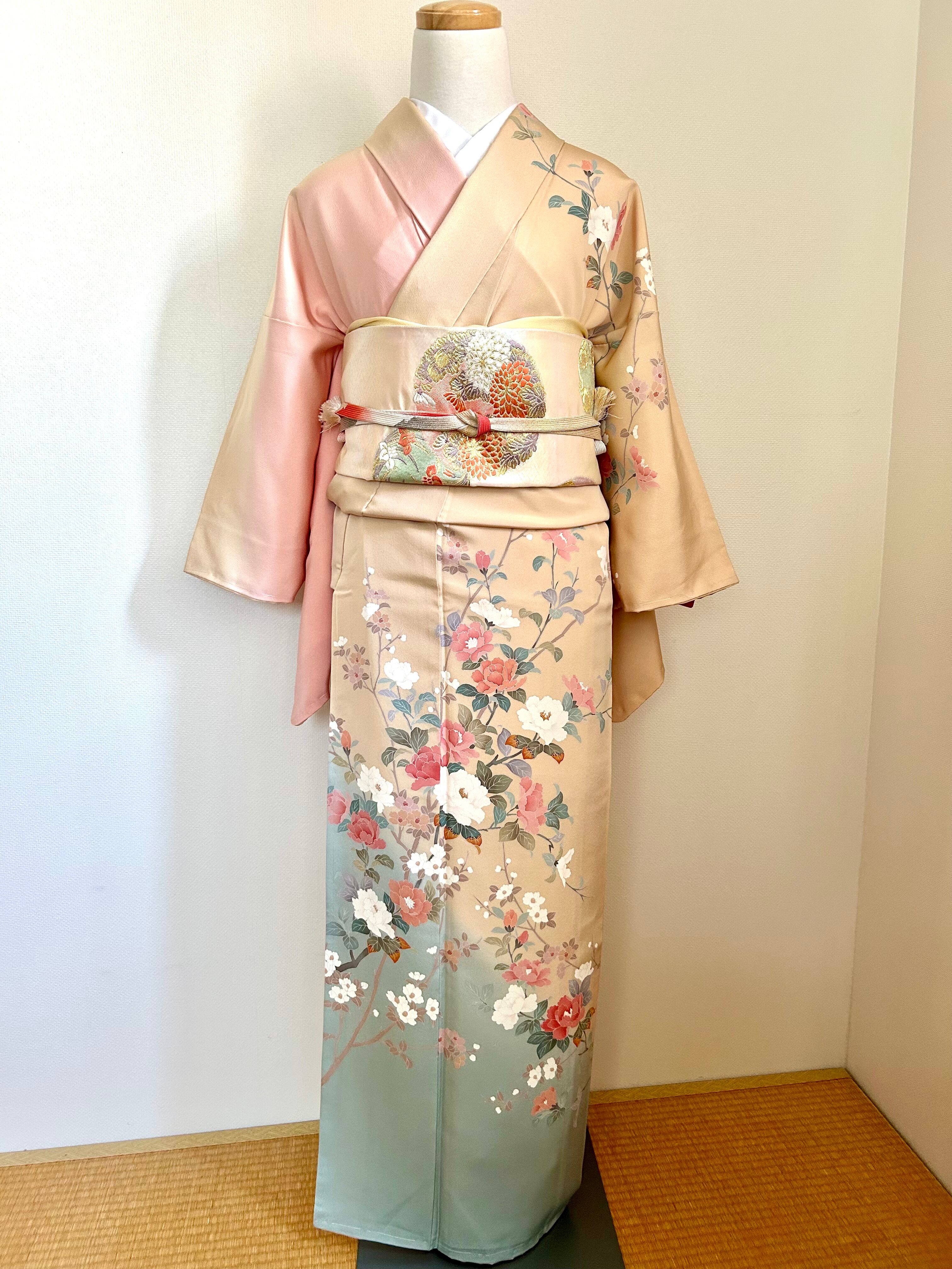 淡いピンク・ベージュ・グリーンのグラデーションが美しく、裾のグリーンが全体の印象を引き締めてくれています。