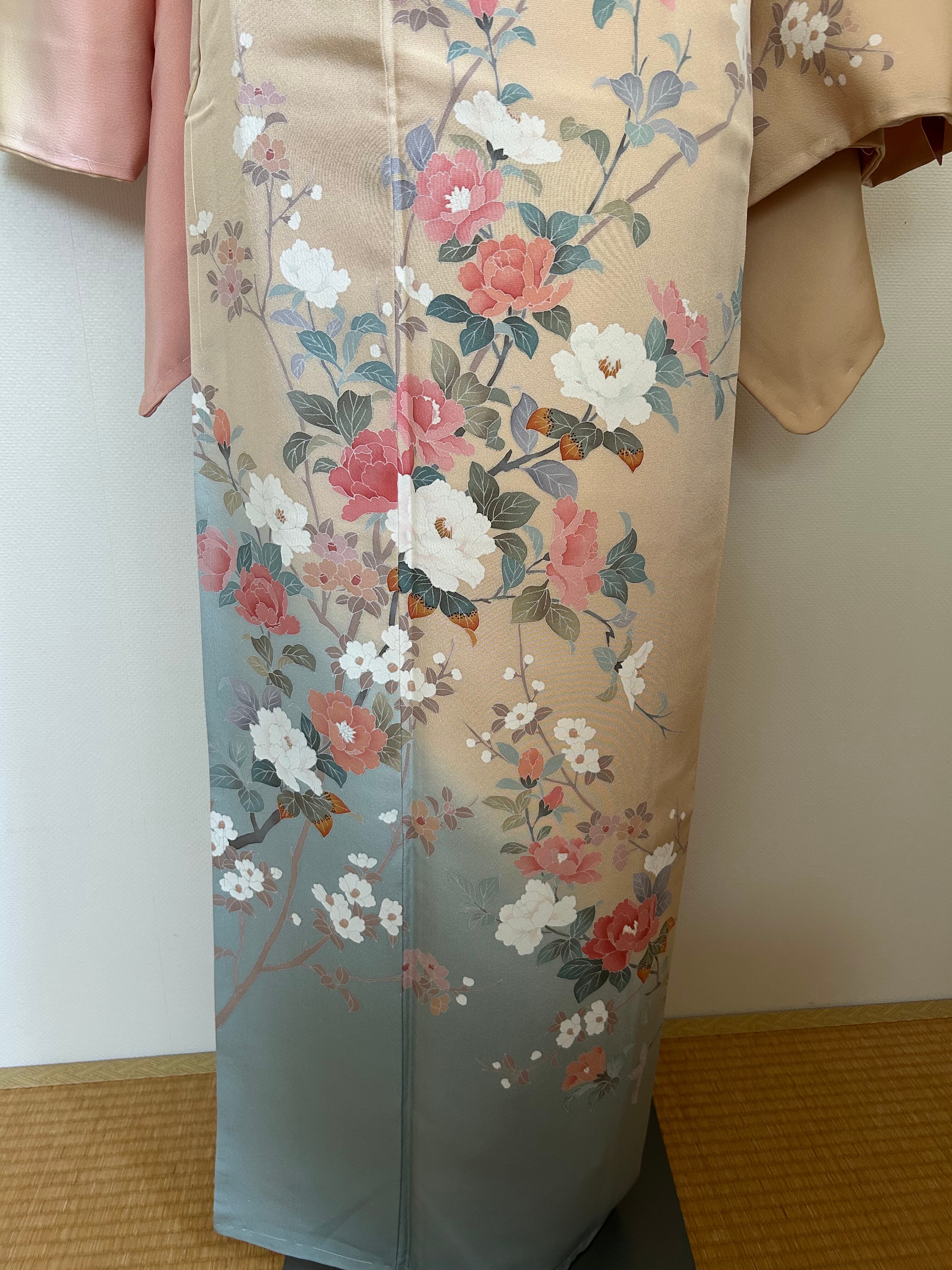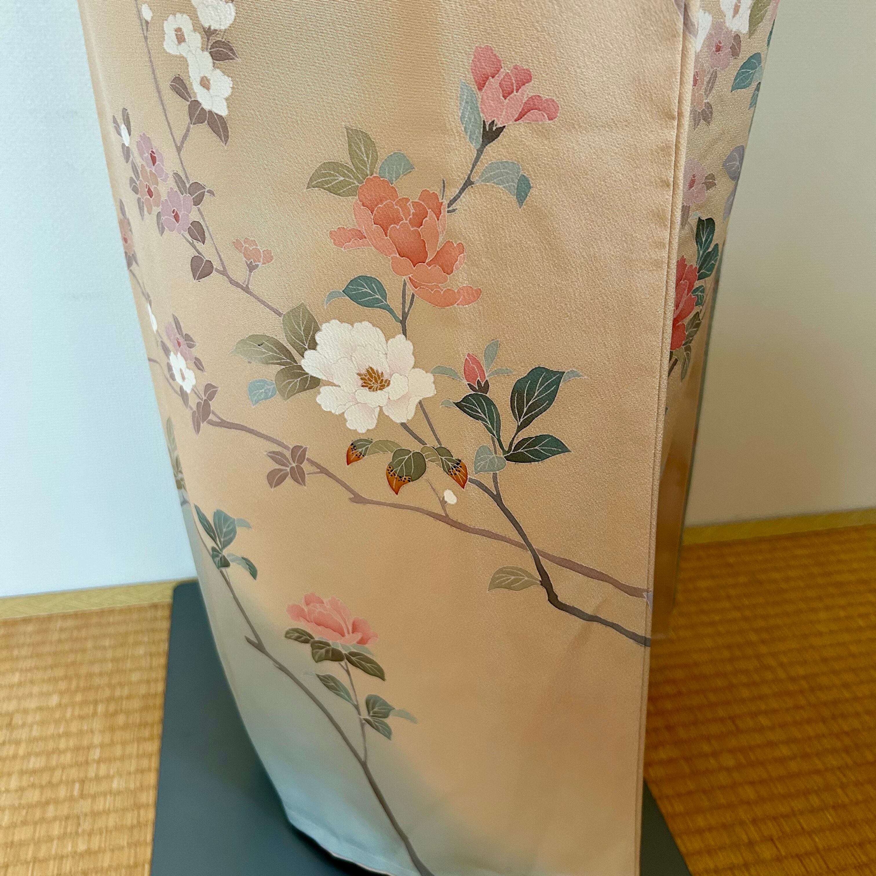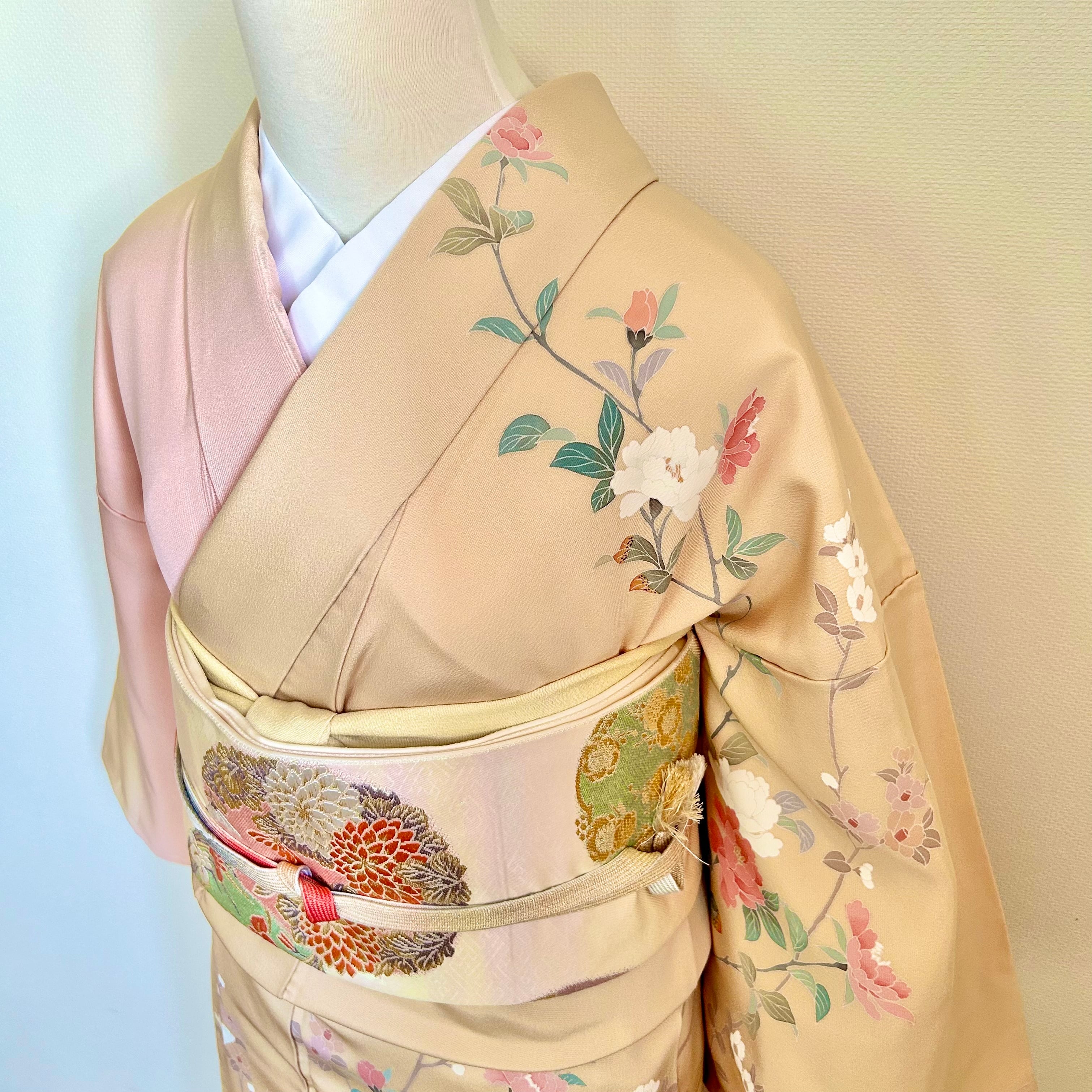 椿と牡丹が描かれた、加賀友禅の訪問着です。