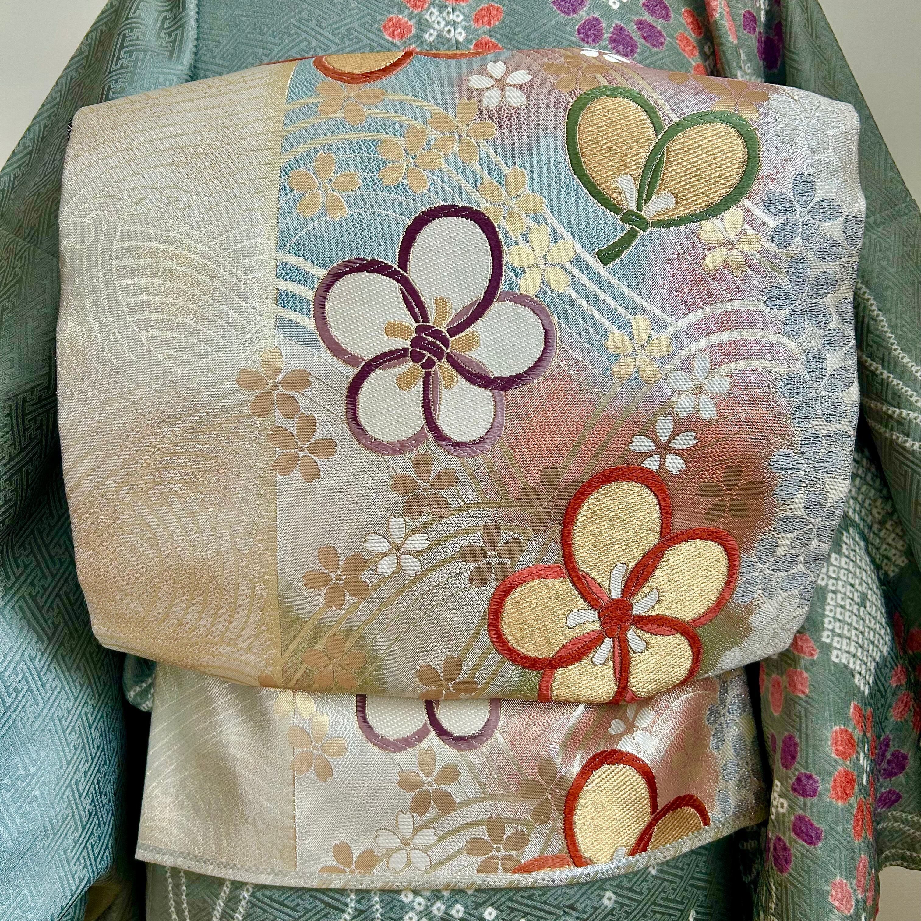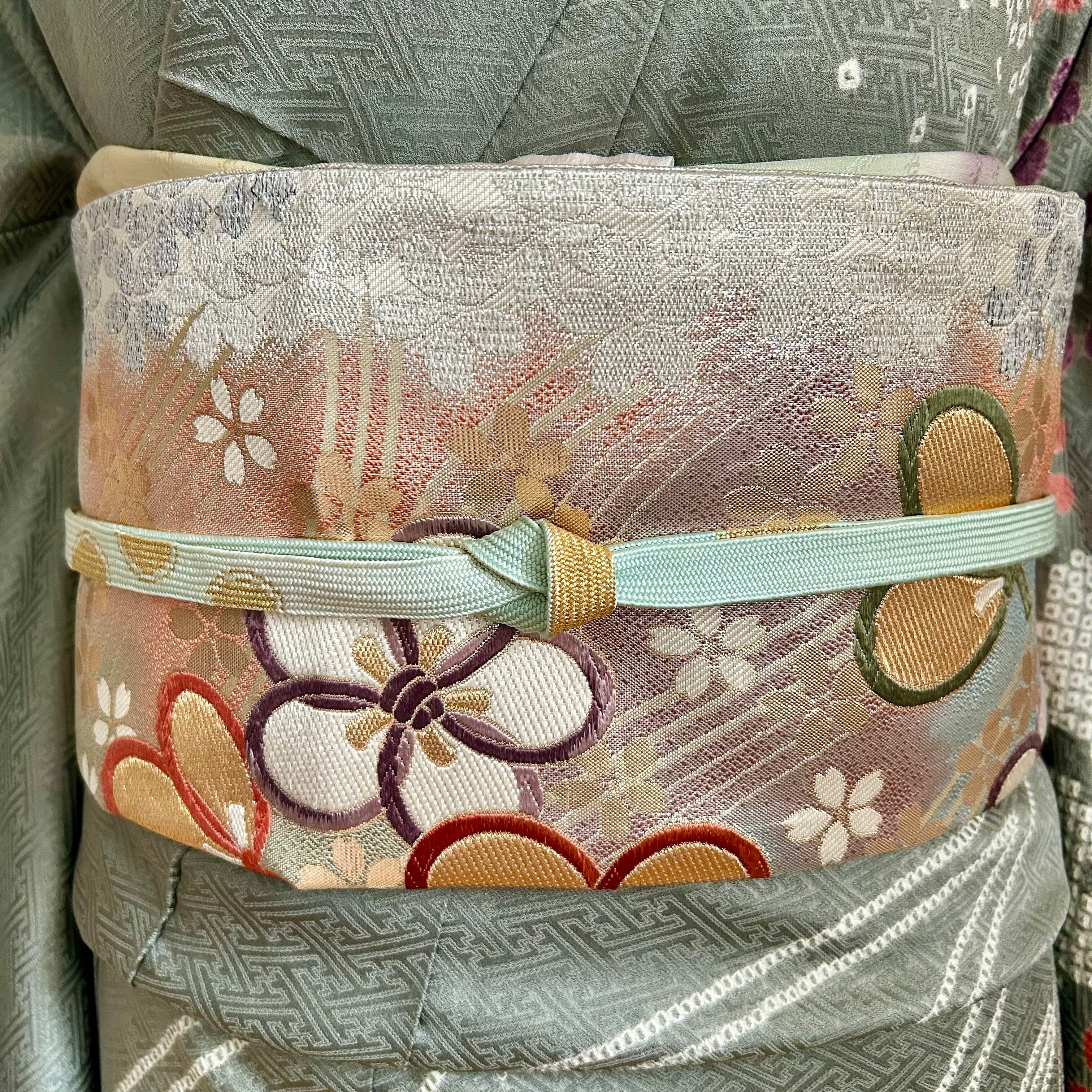 帯はピンク・シルバーのグラデーション地に、捻梅や桜が織りだされた袋帯。