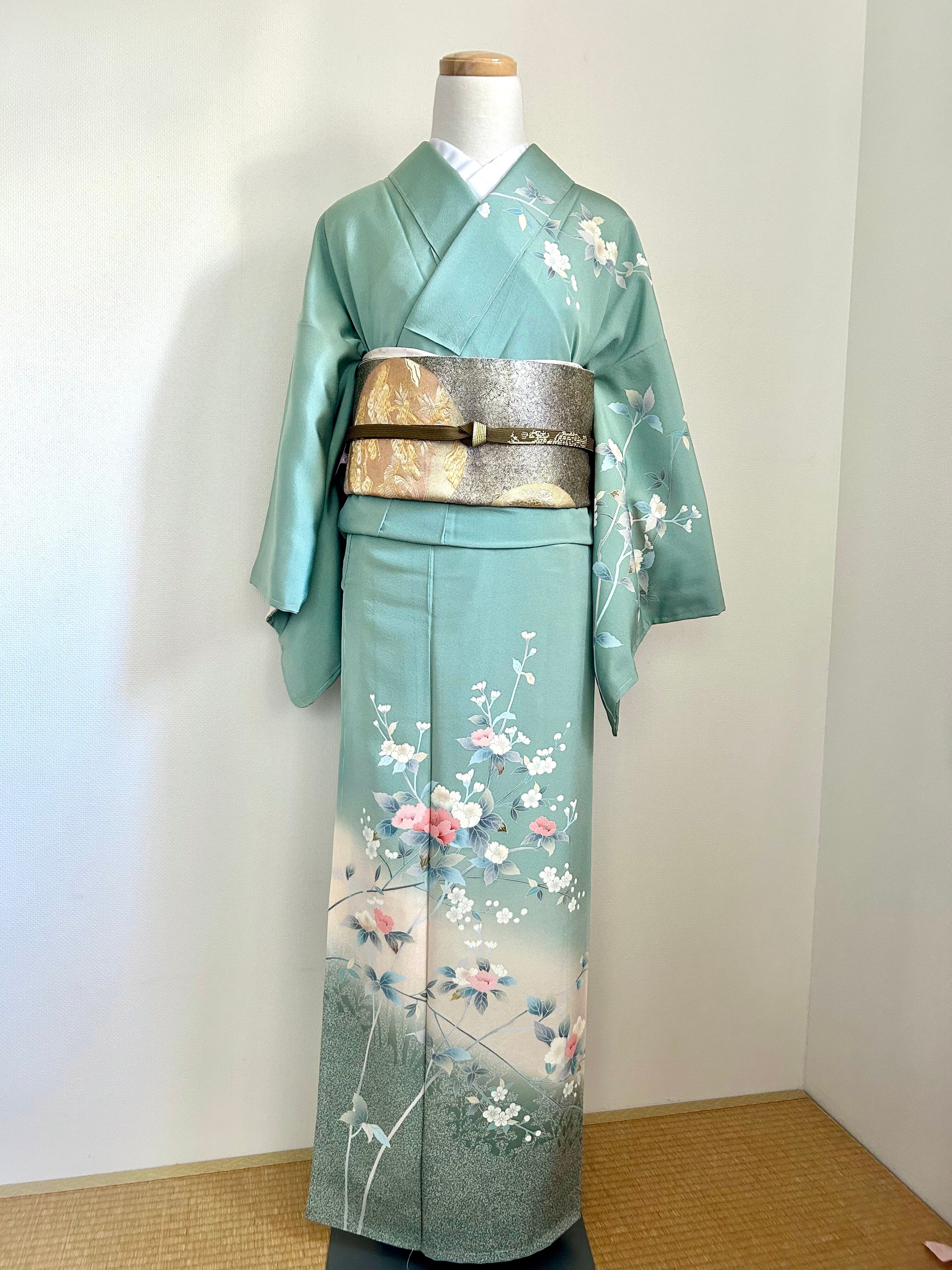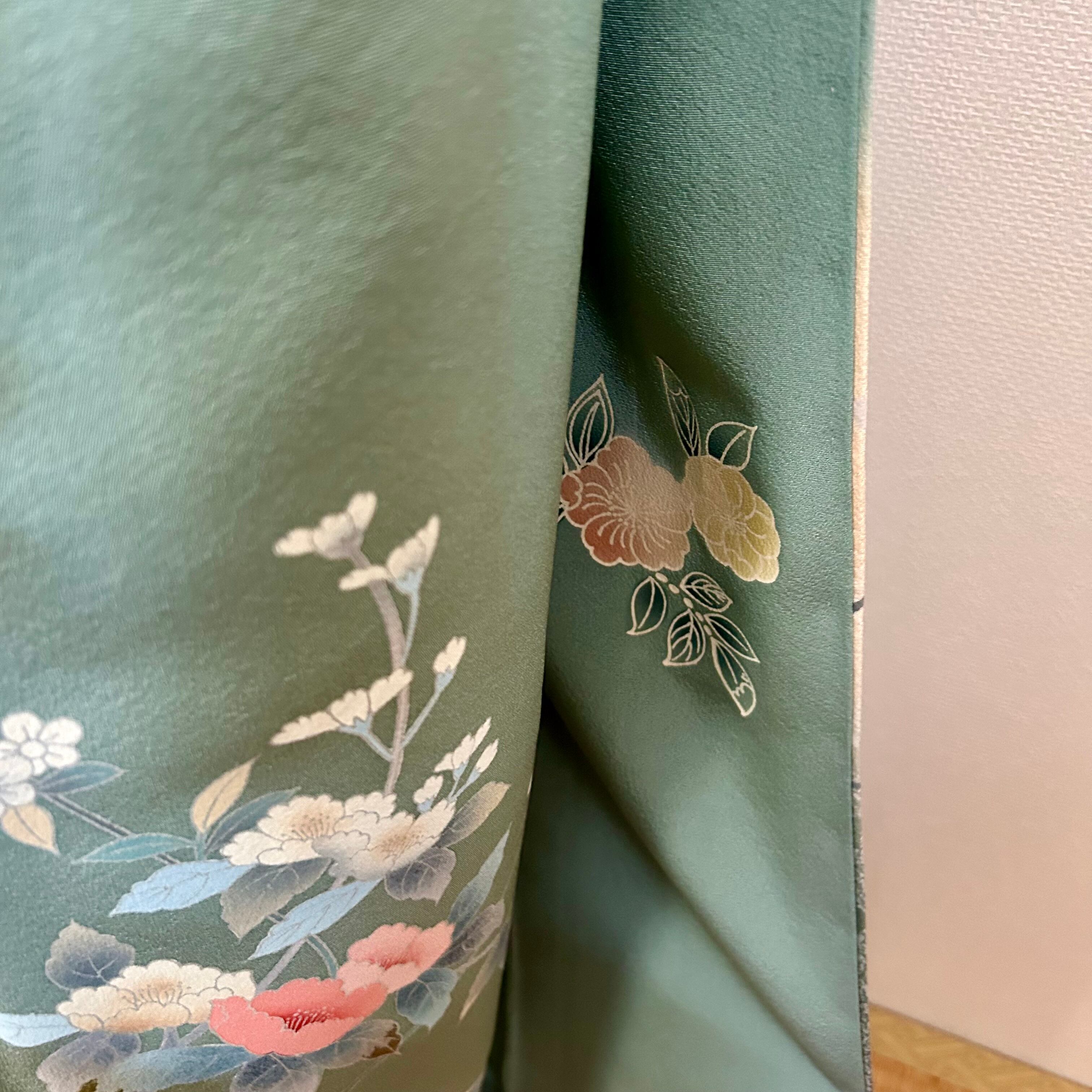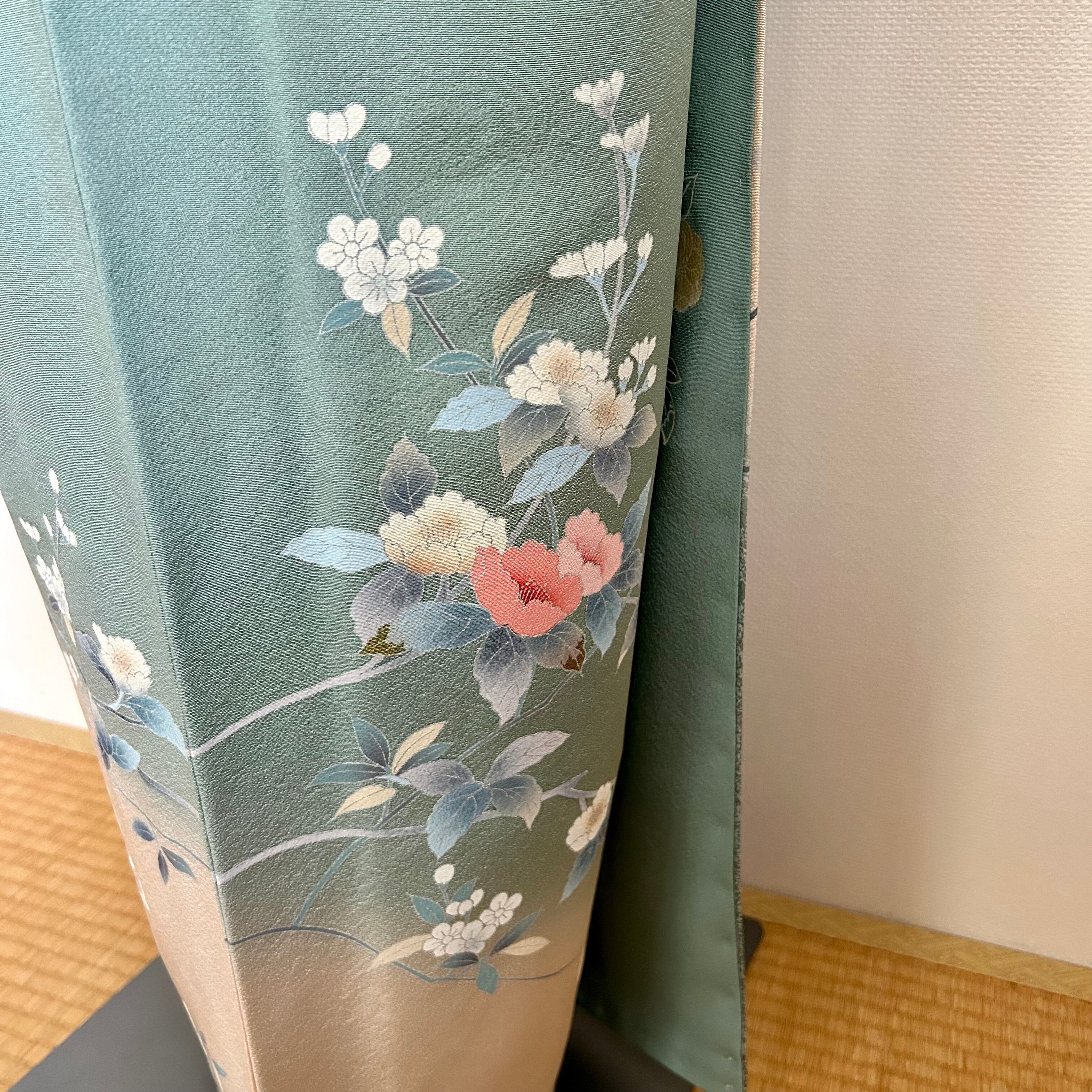 友禅の訪問着は、爽やかなペールグリーンに牡丹などの花が描かれています。