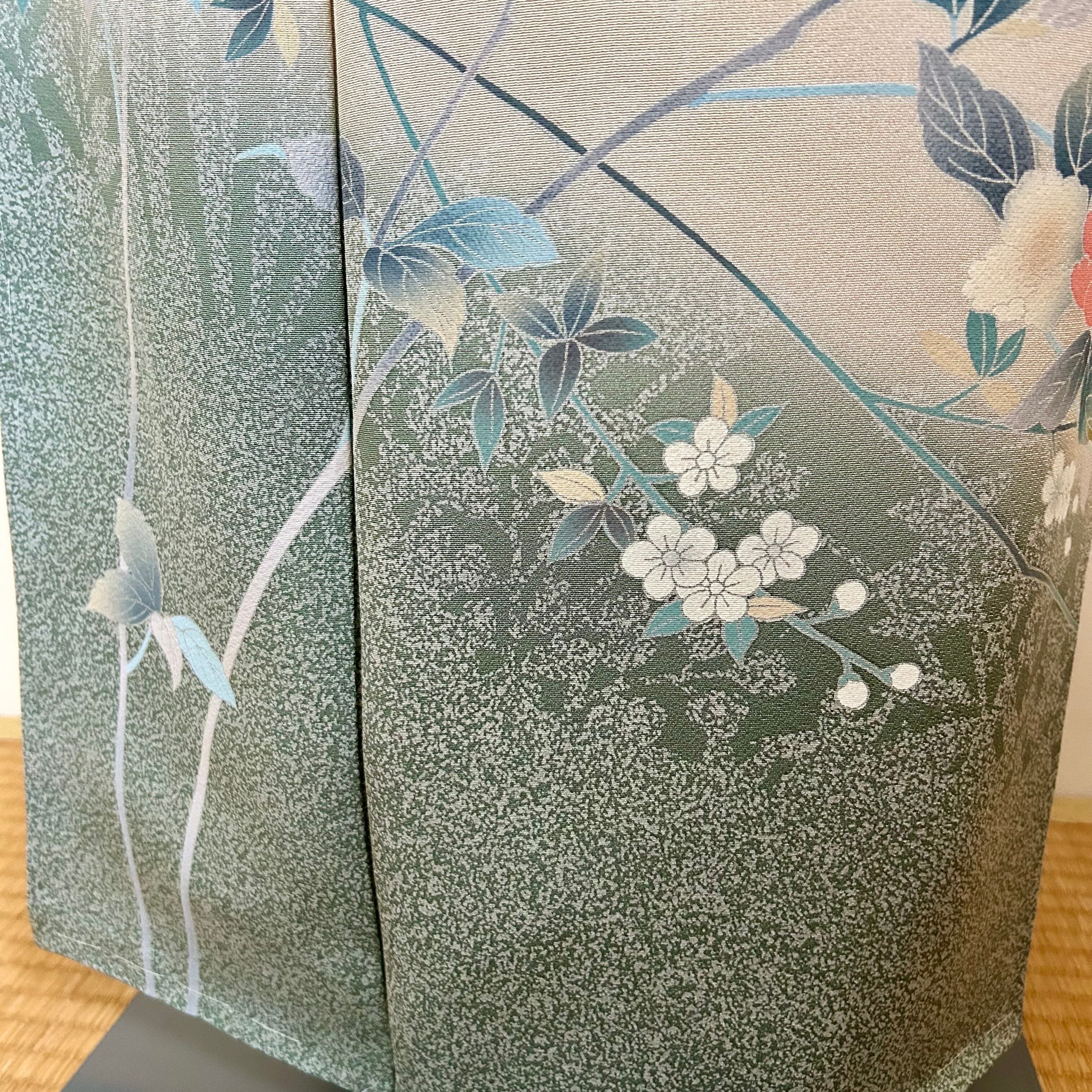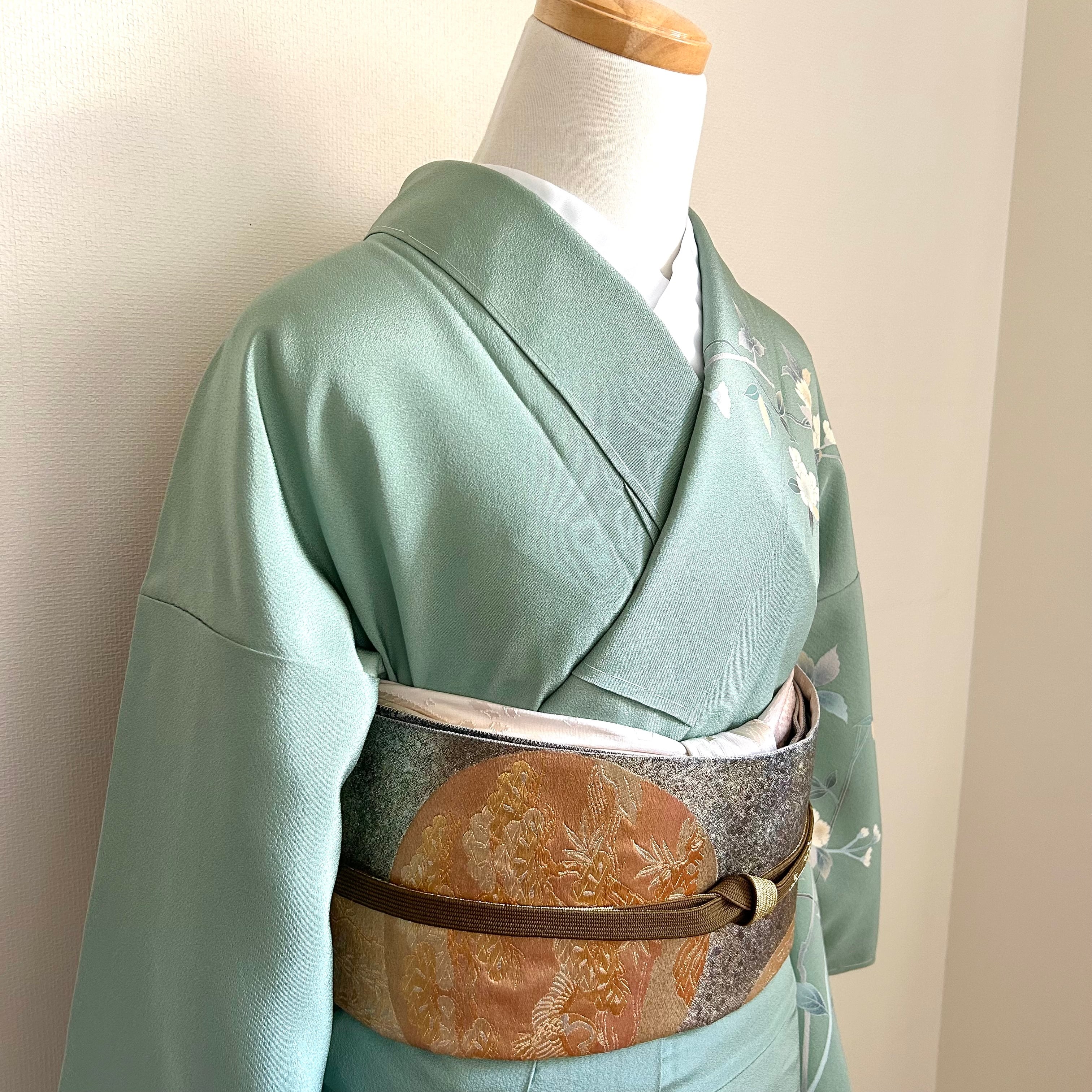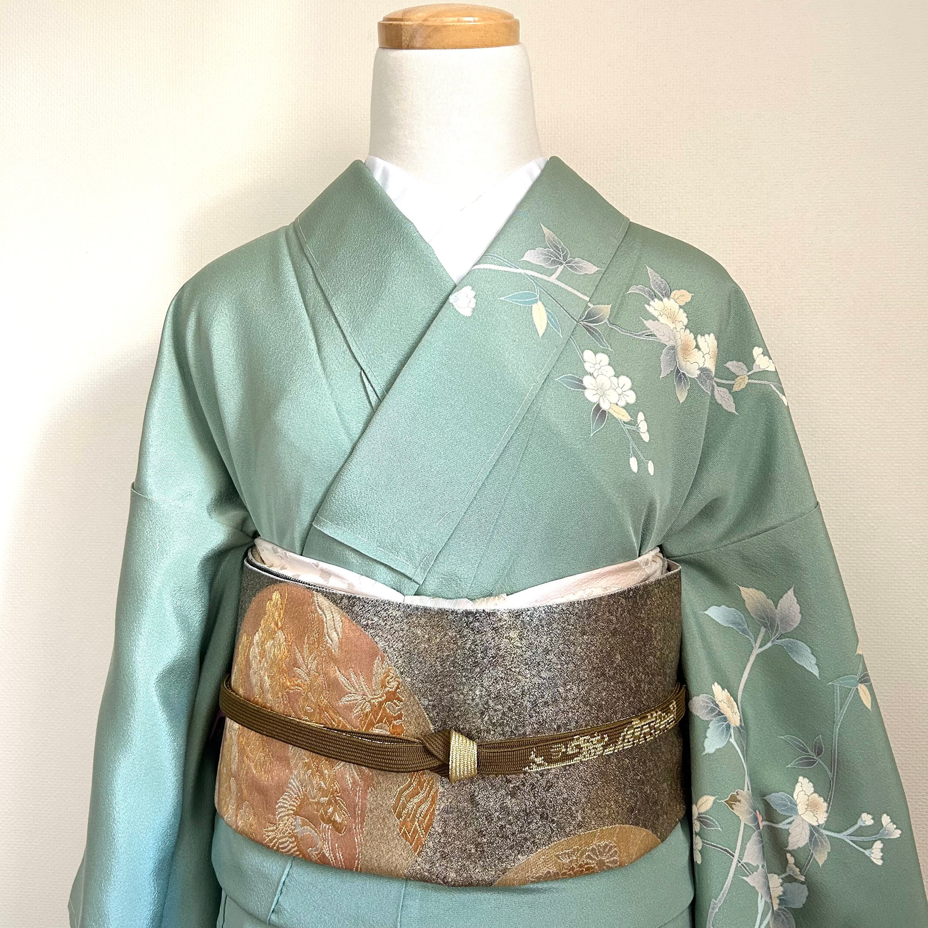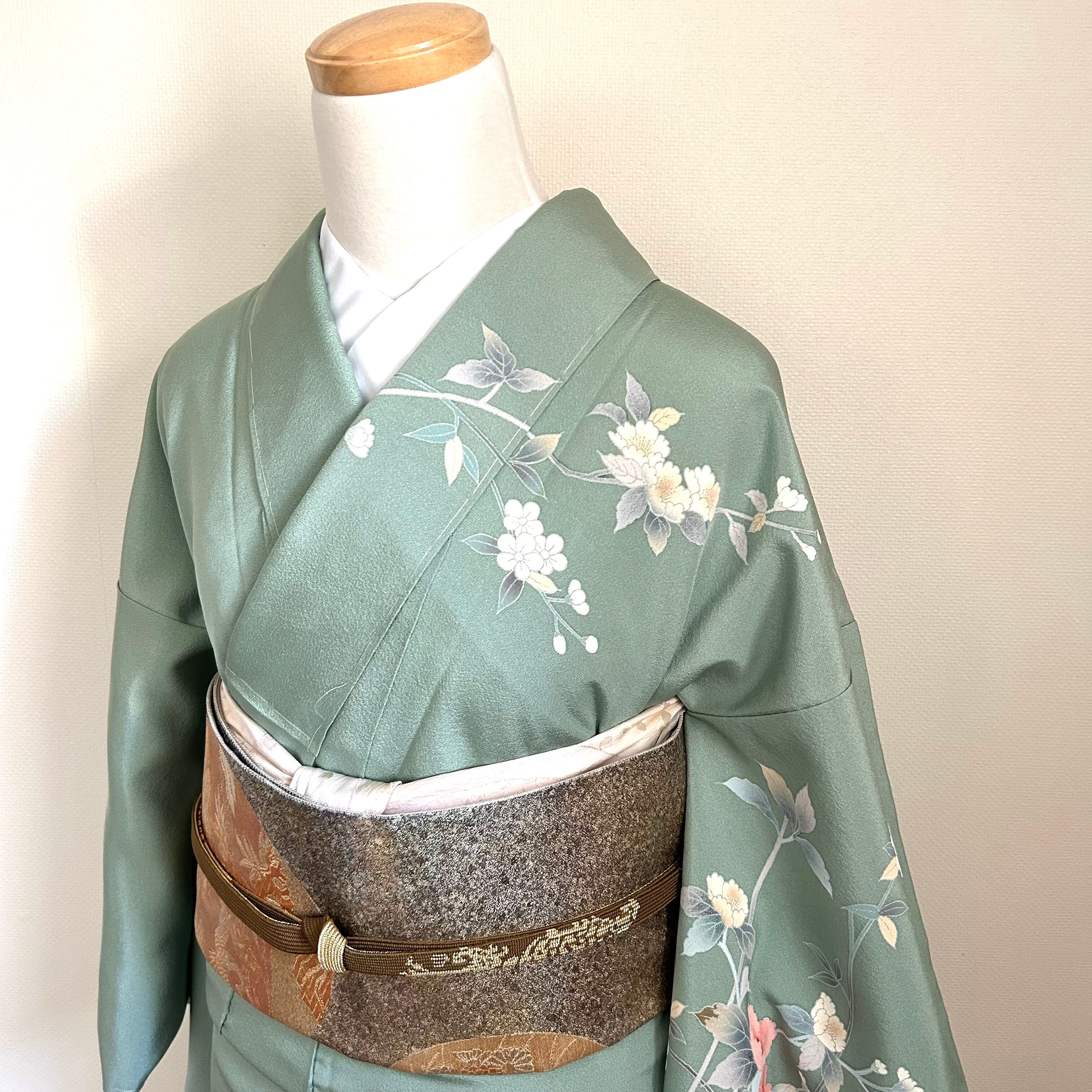 友禅の訪問着は、爽やかなペールグリーンに牡丹などの花が描かれています。
