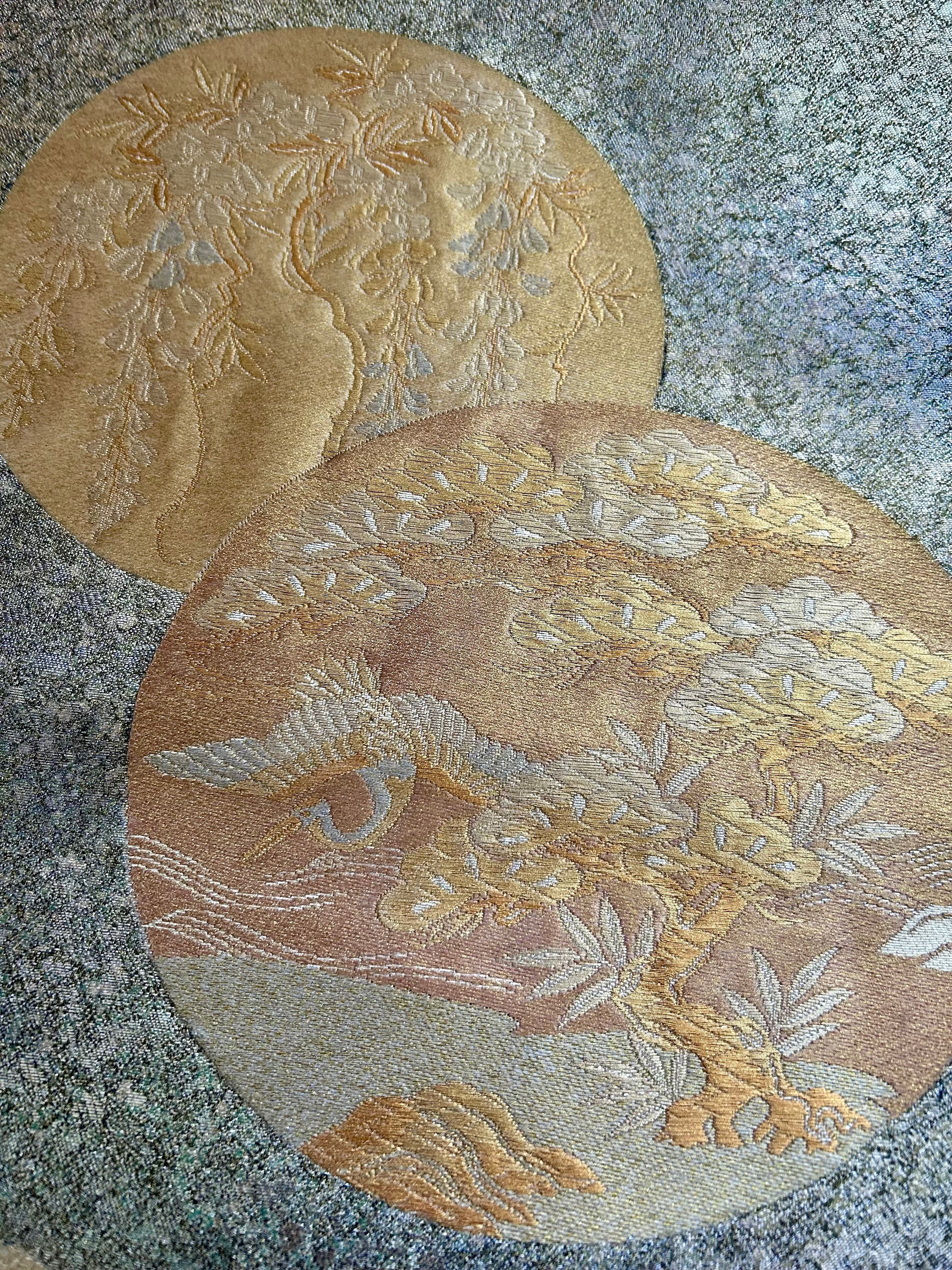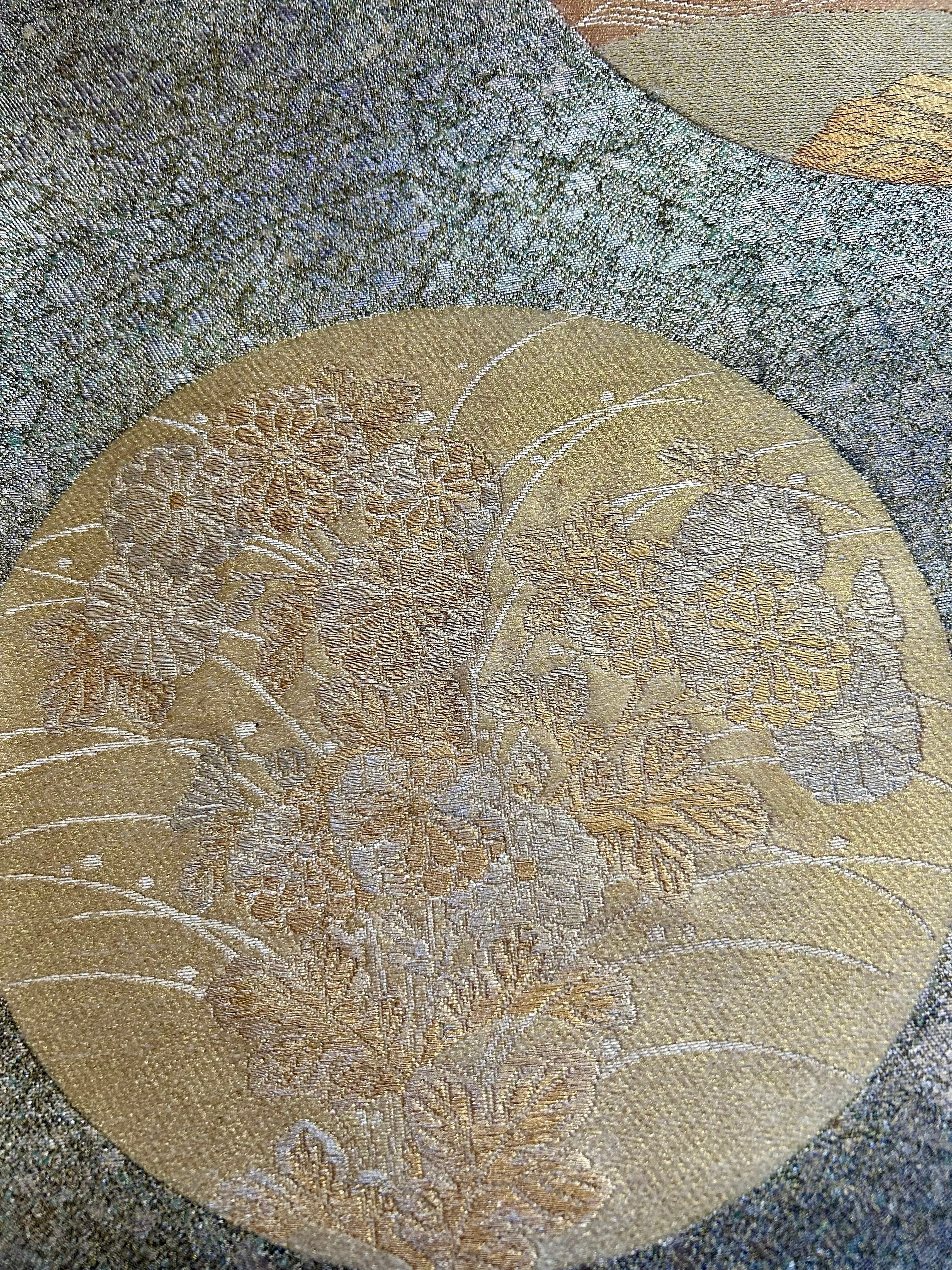 帯はシックなグレー地にゴールドの文様、鶴・松・菊などが織りだされた袋帯。