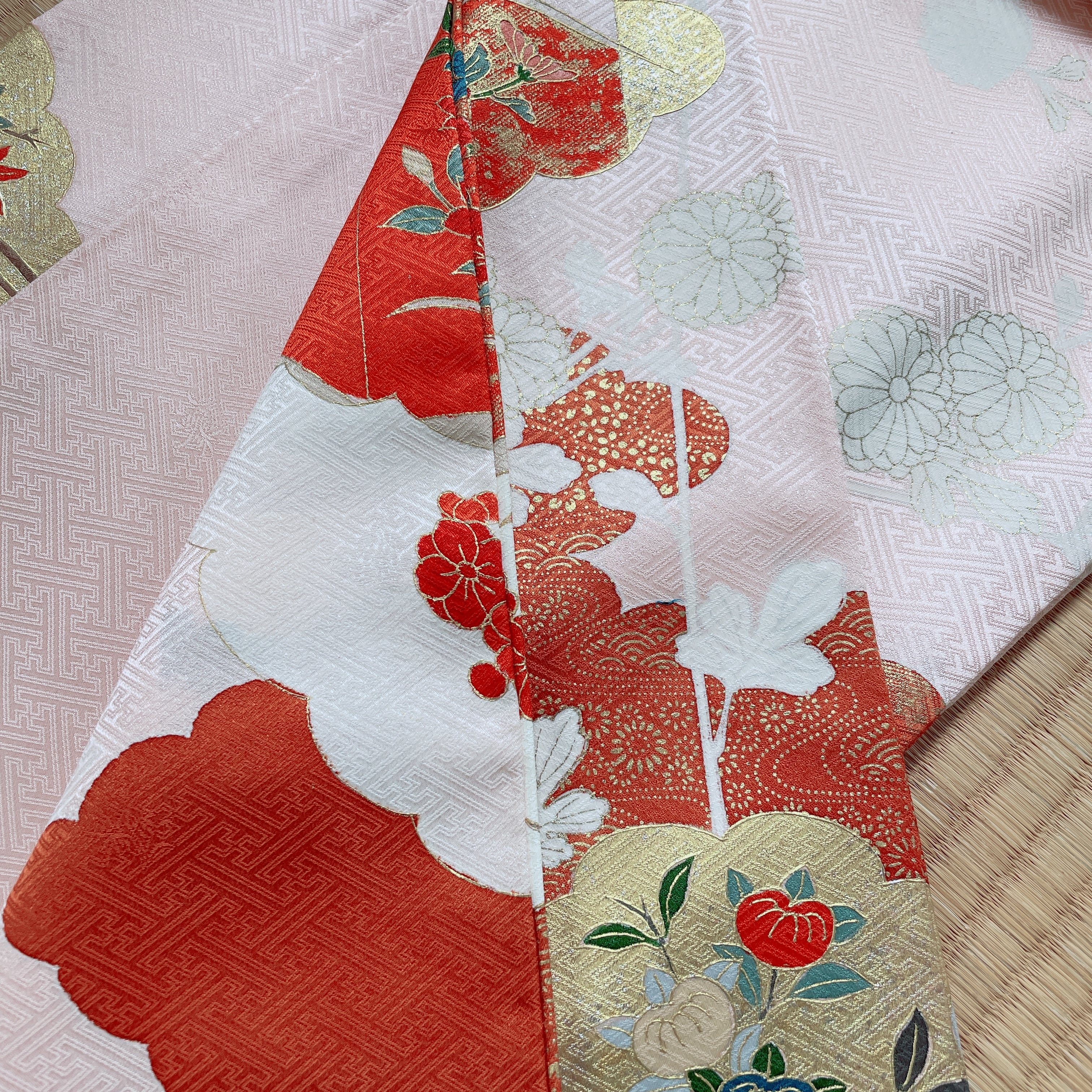 上品な淡いピンクに紗綾形の地紋、松や花模様に刺繍が入った華やかな訪問着です。