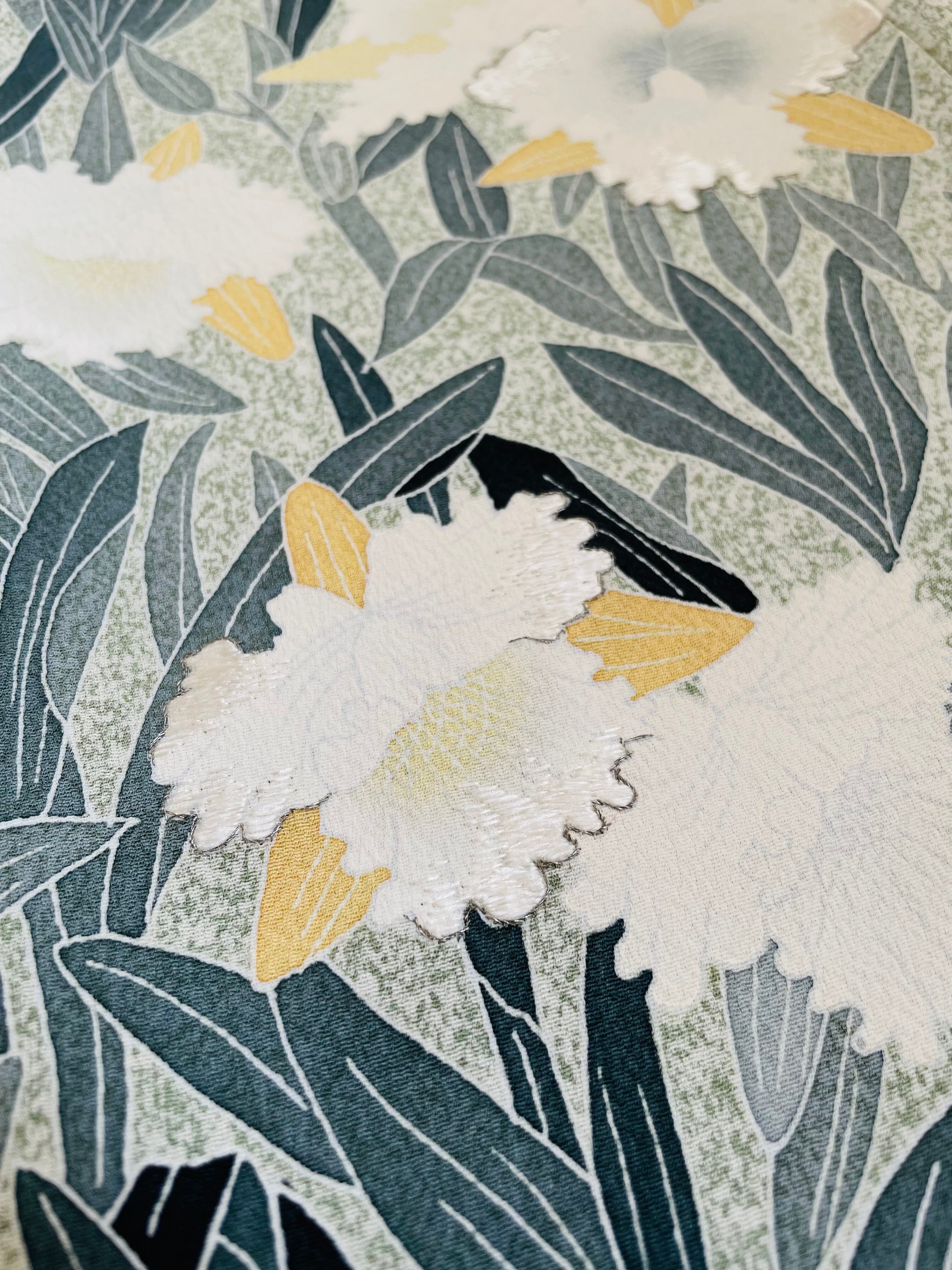 葉の部分の色がグラデーションになっていたり、ところどころ刺繍や銀糸の縁取りなどもあり、シンプルですが華やかな印象です。