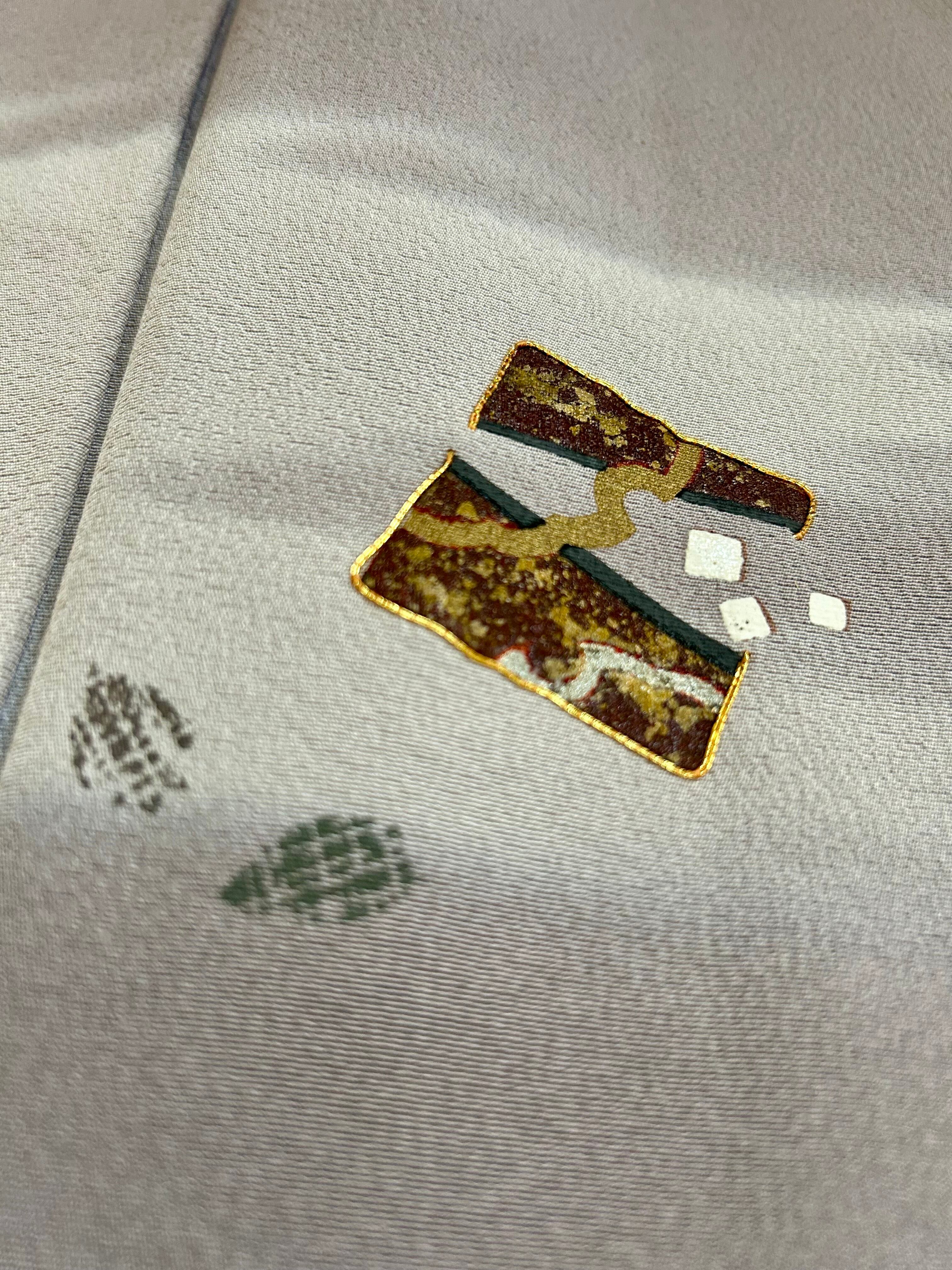 ざらっとした手触りのグレー地に、霞と桜の花びら模様が入った付下げです。